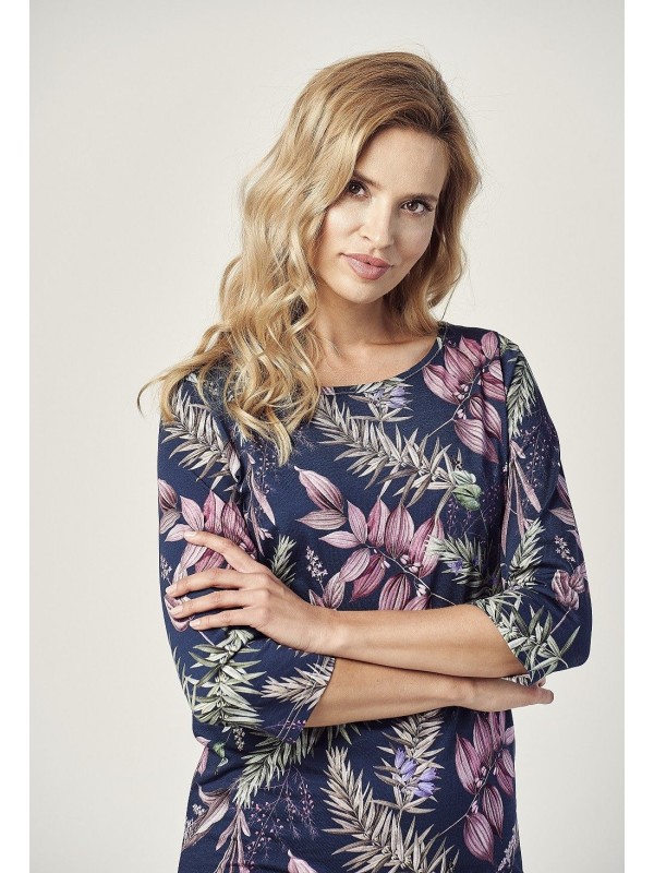 Design elegant: Mâneci 3/4, decolteu semirotund și un imprimeu floral deosebit.