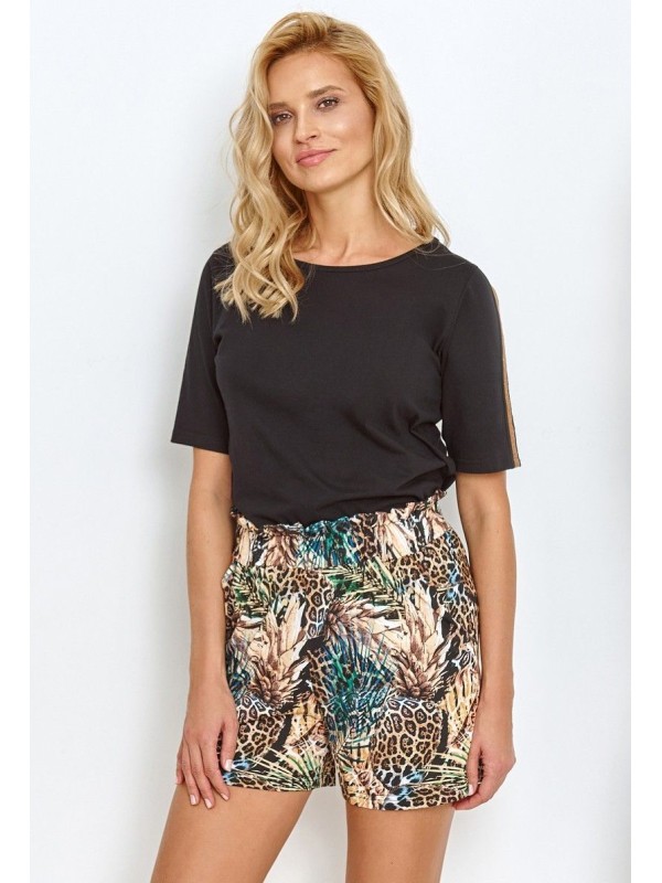 Compoziție: Bluza cu mânecă scurtă și decolteu rotund, completată de pantaloni scurți cu talie elastică confortabilă