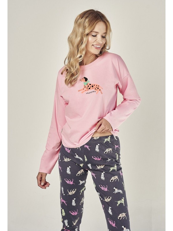 Design jucăuș: Setul constă într-o bluză cu mâneci lungi și decolteu rotund, completată de pantaloni lungi cu mansete și talie elastică confortabilă. Întregul set prezintă un model deosebit cu cățeluși, adăugând un plus de stil și unicitate ținutei tale.